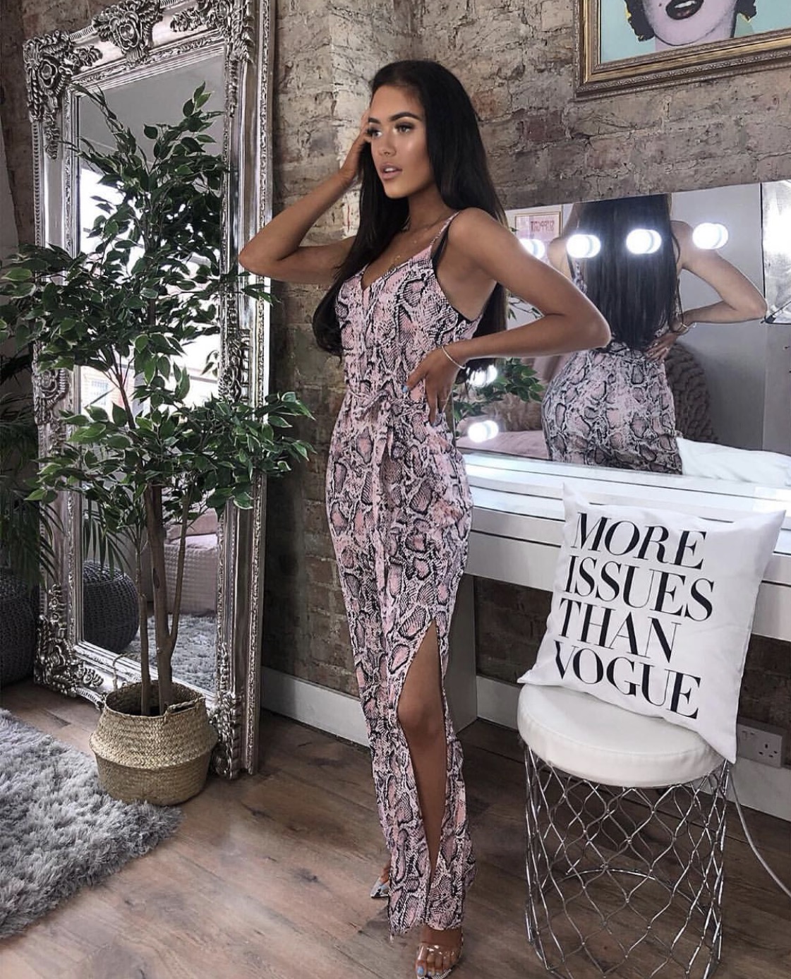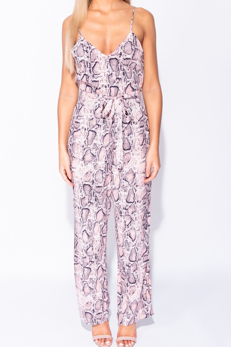 Snake Print Side Slit Belted Cami Jumpsuit